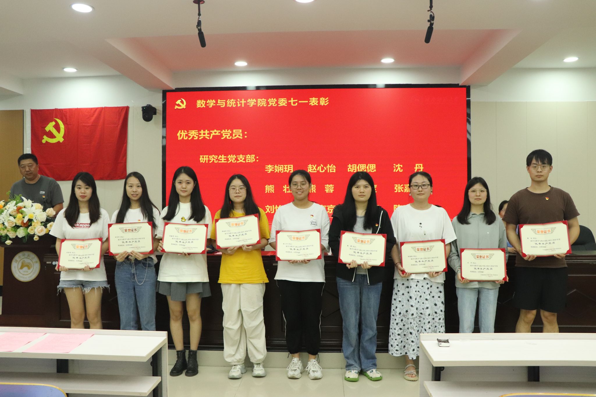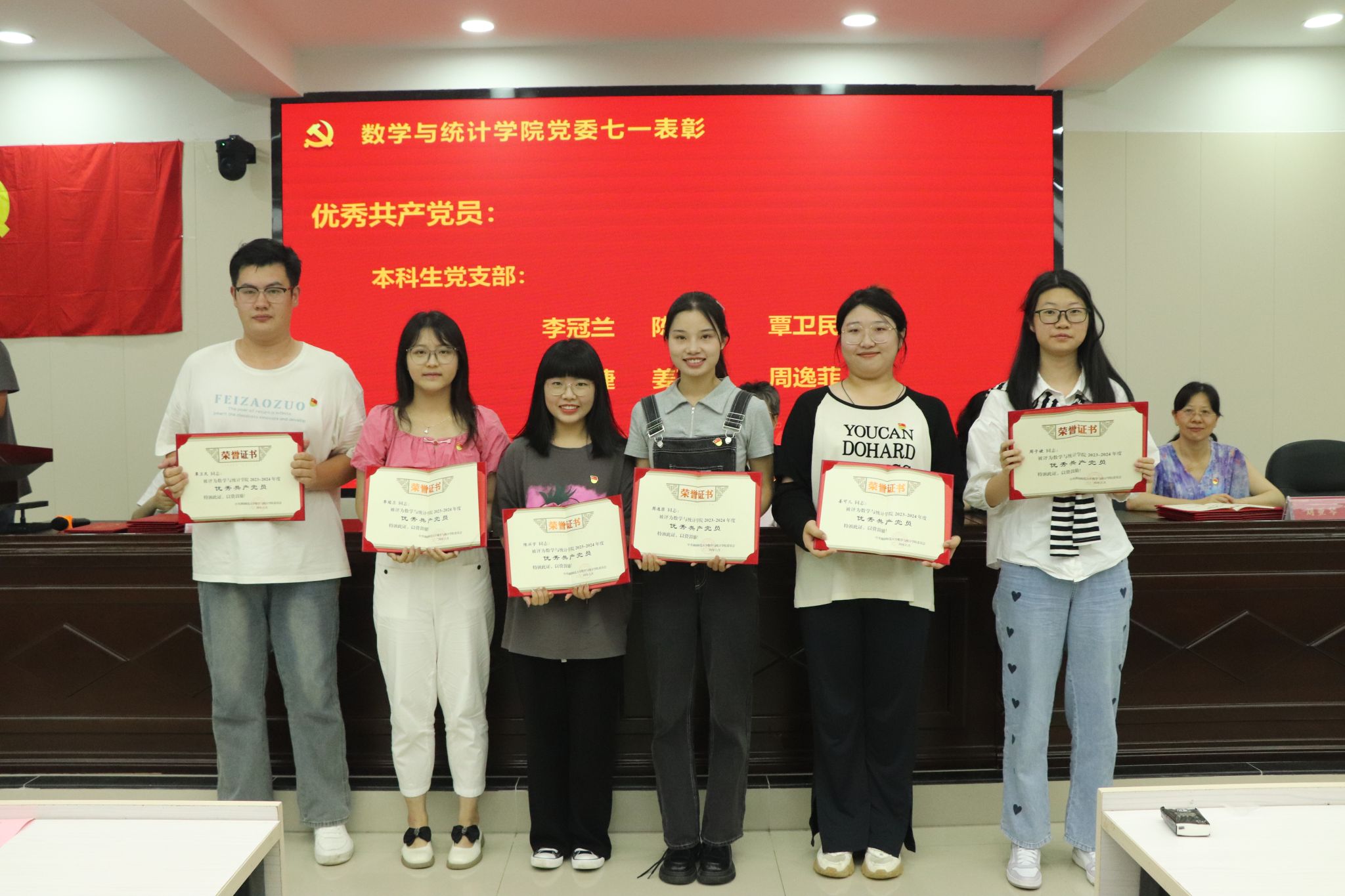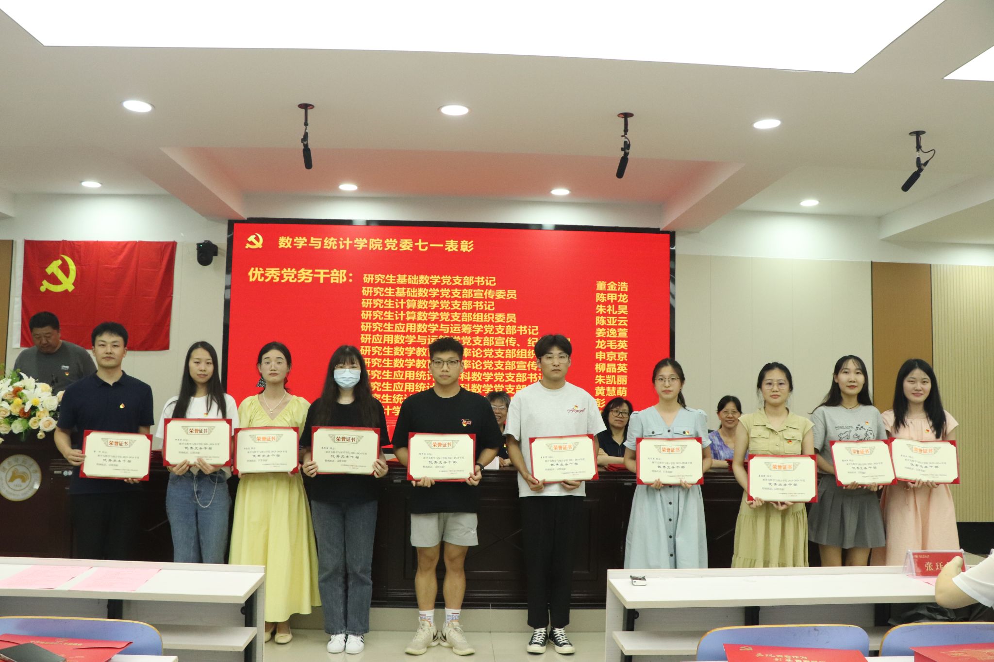 专职组织员覃志斌老师宣读了2023-2024年度学院优秀共产党员、优秀党务工作者的表彰名单,并由学院党委领导给获奖者颁发奖状。颜中玉代表学院党委向获得表彰的同志表示祝贺,要求各级党组织、广大党员向先进榜样学习,引领全体师生牢记初心使命、勇于担当作为,以高质量党建引领学院各项事业高质量发展。