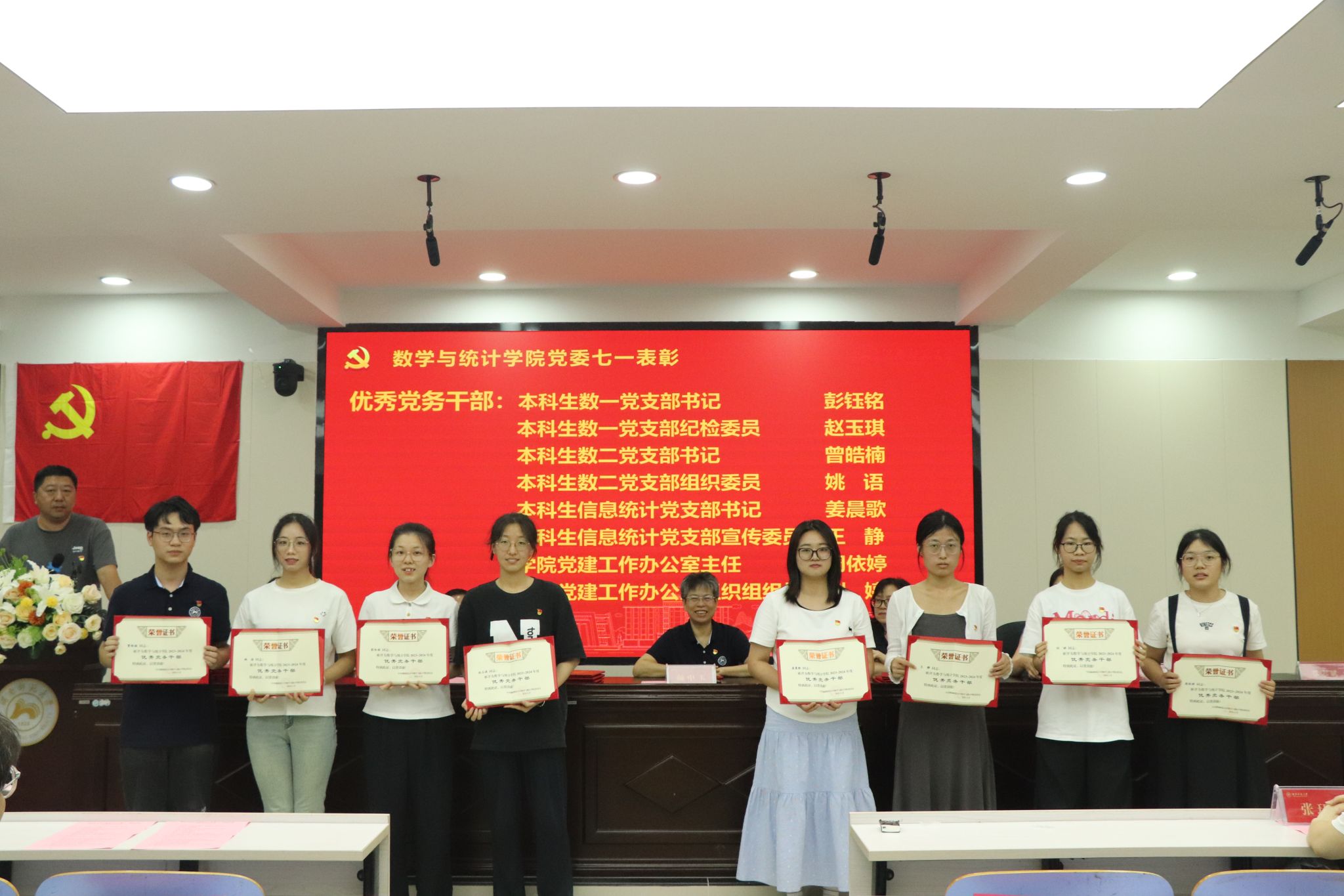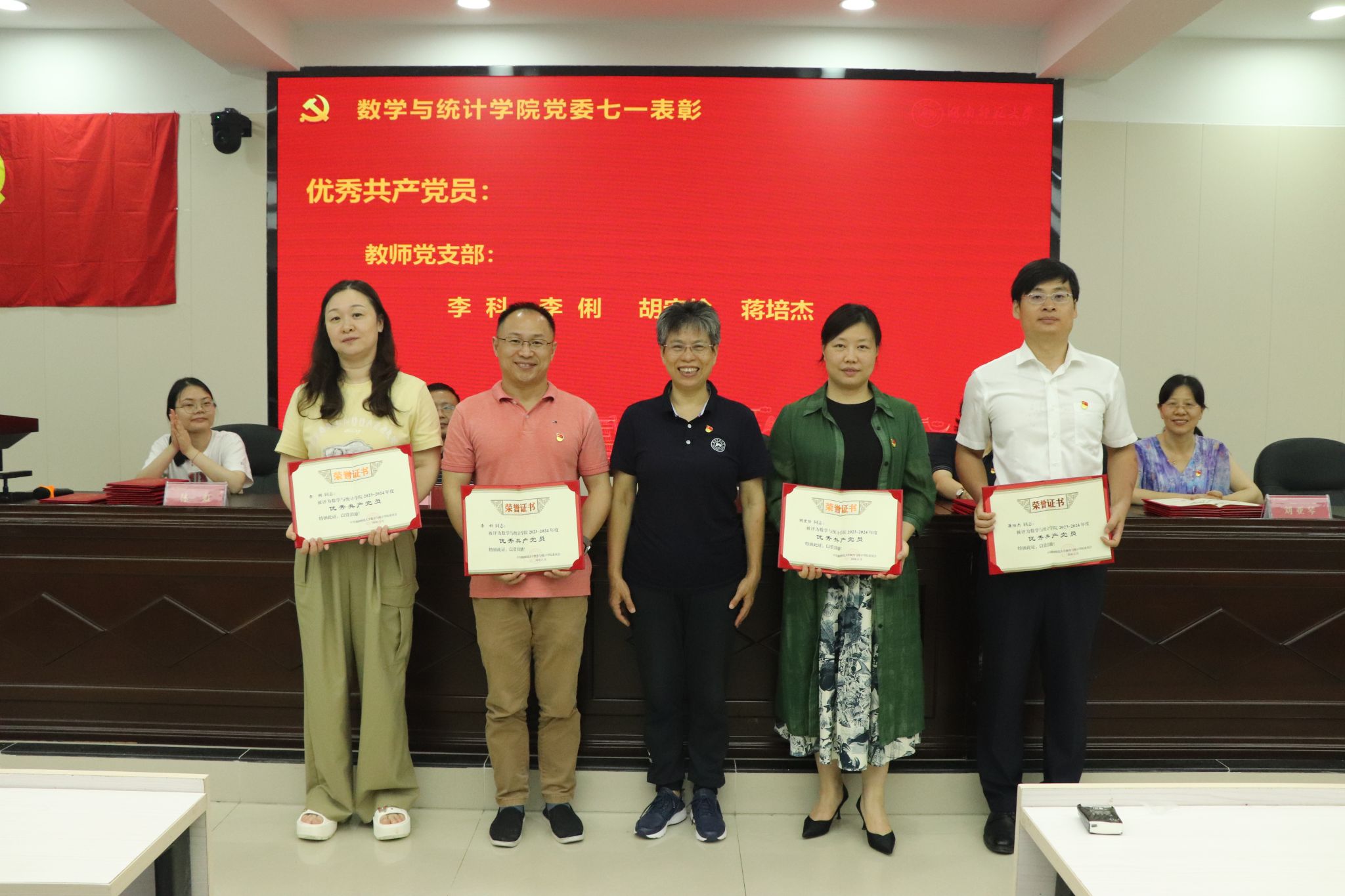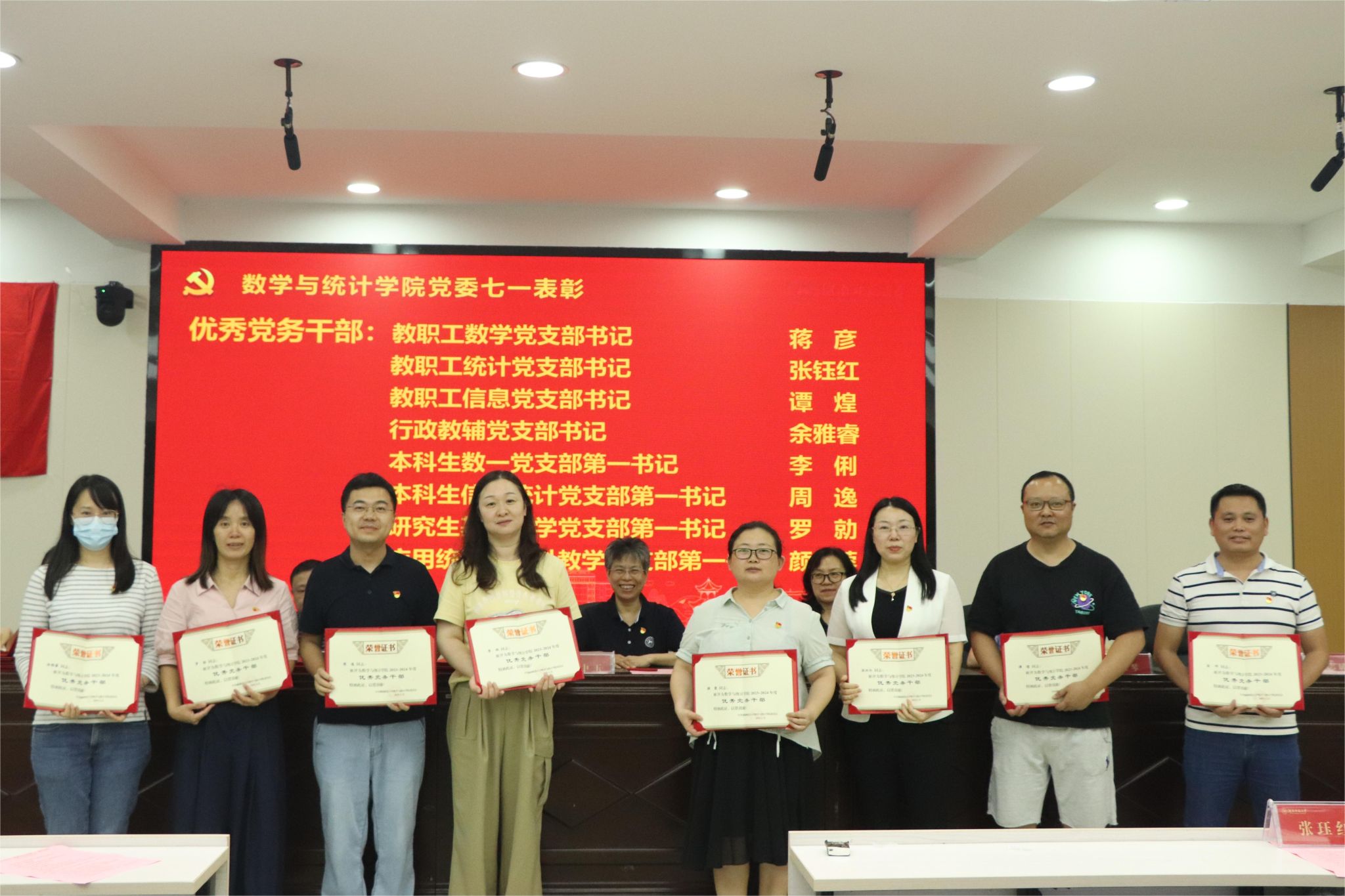 专职组织员覃志斌老师宣读了2023-2024年度学院优秀共产党员、优秀党务工作者的表彰名单,并由学院党委领导给获奖者颁发奖状。颜中玉代表学院党委向获得表彰的同志表示祝贺,要求各级党组织、广大党员向先进榜样学习,引领全体师生牢记初心使命、勇于担当作为,以高质量党建引领学院各项事业高质量发展。