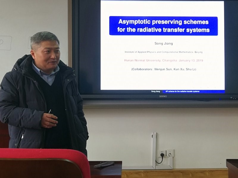 (通讯员 袁永军 龚艳红)2019年1月13日下午,应js33333金沙线路检测邀请,中国科学院院士、北京应用物理与计算数学研究所研究员、应用数学与计算数学专家江松莅临数统院,并为学院师生带来题为“Asymptotic preserving schemes for the radiative transfer systems”的精彩学术报告。报告在数统院307报告室进行,由数统院院长谢资清主持。