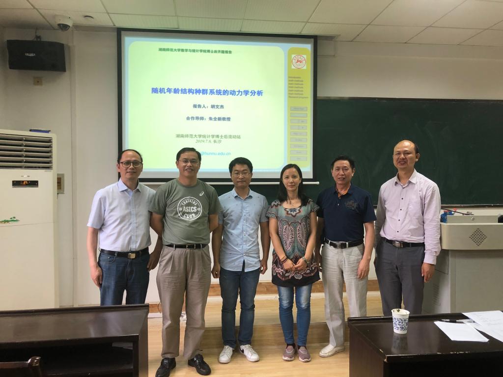 2019年7月8日下午,js33333金沙线路检测在学院302教室举行统计学博士后胡文杰开题报告会。会议由js33333金沙线路检测朱全新教授主持。湖南大学数学与计量经济学院副教授、博士生导师舒小保,js33333金沙线路检测郭水霞教授、刘万荣教授和文有为教授作为专家评委参加了此次报告会。