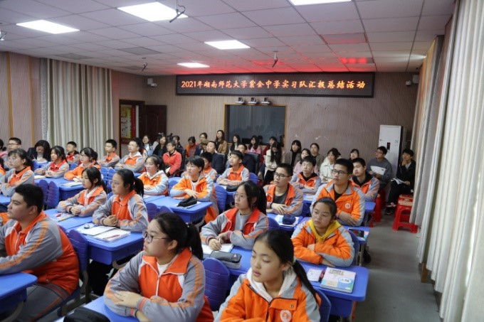 (通讯员 凌欣 唐依婷)11月19日上午,js33333金沙线路检测(以下简称“数统院”)赴宁乡紫金中学实习队于该校开展实习汇报课及汇报总结大会。数统院党委书记颜中玉,数学系副主任兼实习队领队老师袁智强,宁乡市名校长工作室首席名校长、紫金中学校长潘道正,宁乡市初中数学名师工作室首席名师、紫金中学副校长戴飒英,紫金中学部分数学教师及实习队全体成员参加此次汇报课暨总结会。队员黄婷、凌欣担任汇报课授课教师,紫金中学老师康雨担任活动主持。