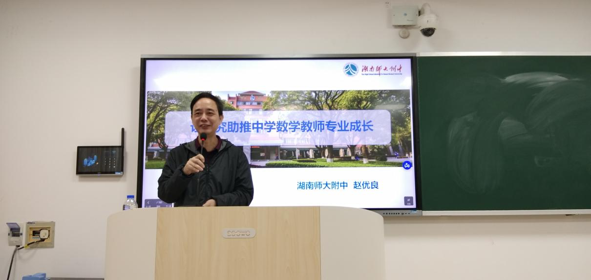 (通讯员:蒋培杰)2022年11月21日上午,长沙市中学数学名师工作室首席名师、湖南师范大学附属中学赵优良特级教师做客js33333金沙线路检测《教育研习》课程,在理学院409学术报告厅进行了一场主题为“让研究助推中学数学教师专业成长”的讲座。讲座由数学教育教研室主任蒋培杰主持,数学系副主任袁智强出席并做总结发言。数学与应用数学专业2019级全体师范生以及数学教育方向部分研究生约200人以线上线下融合的方式参加了会议。